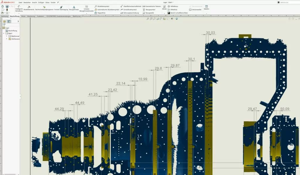 Auf diesem nächsten Bild erkennt man, dass die roten Ringe gemeinsam mit den 3D-Scandaten in SolidWorks importiert wurden. Dort wurden die Positionen mit den Bemaßungsfunktionen bemaßt.