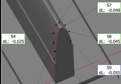Para herramientas de mayor tamaño, las funciones de ampliación de volumen de MetraSCAN 3D han demostrado ser particularmente útiles. Al realizar mediciones extremadamente exactas, los reflectores pueden colocarse en la herramienta, en las ubicaciones previamente medidas con el rastreador láser (mediciones periódicas, por ejemplo, de forma anual) y MetraSCAN 3D vuelve a alinearse localmente según la exactitud del rastreador.