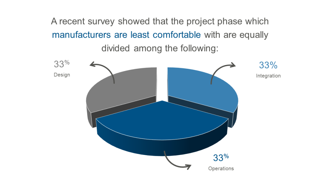 ロボット工学のスキルや専門知識を持った従業員の不足によって、プロジェクト開発がいかに妨げられるかについてより詳しく探るため、設計、統合、運用のどの段階で最も不安を感じているか、製造企業に対して調査を行いました。しかし、回答からは、不安に感じる段階を特定することはできませんでした。