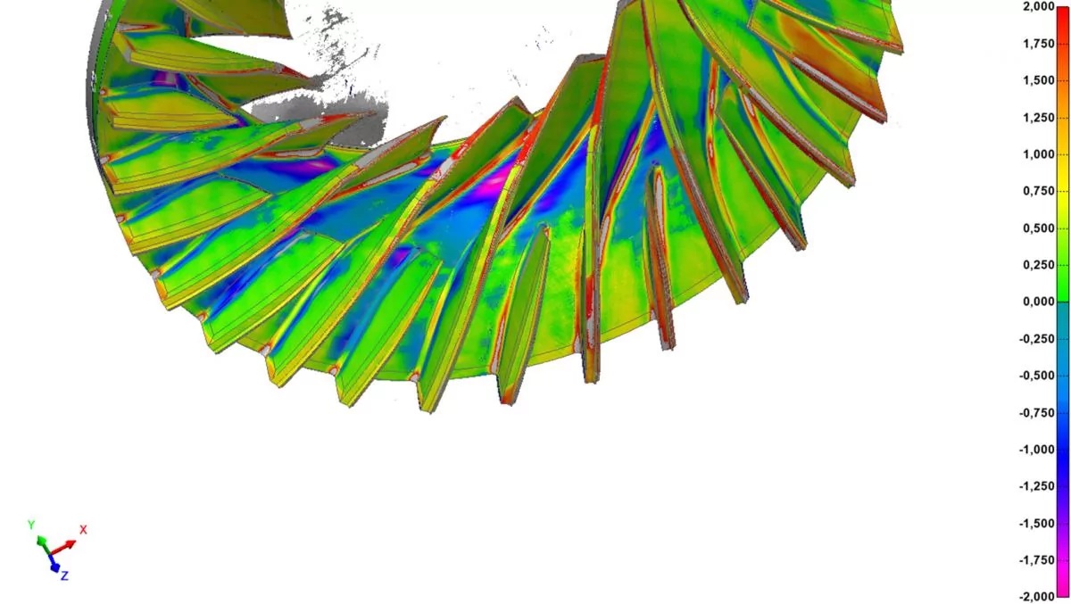 3Dスキャンによって、ブレードの寸法情報をターゲットデータ(CAD)と照らし合わせて分析できます。エンジニアは、カラーマッピング機能を使って、測定結果を素早く、簡単、明確に理解できます。