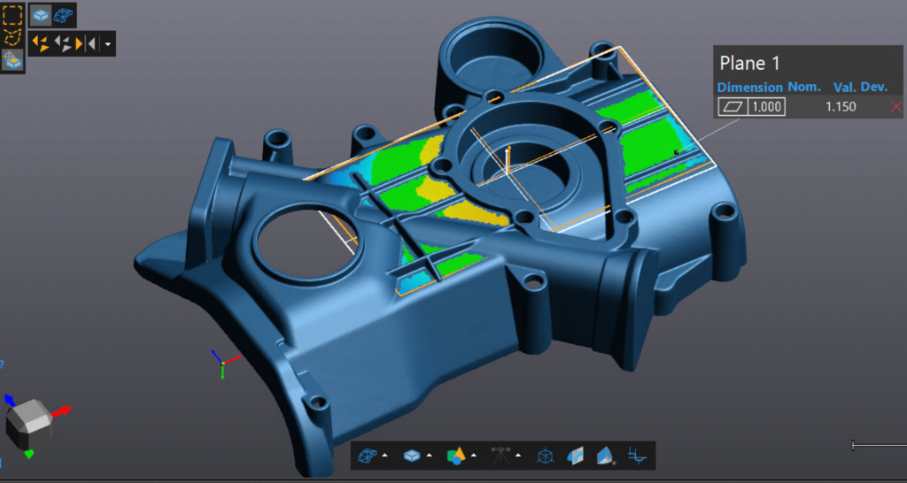 Quando temos um modelo nominal (um CAD) e uma nuvem de pontos adquiridos pela digitalização 3D, basta apenas correlacioná-los registrando os dados digitalizados com o modelo CAD. Para isso, podemos usar datums, que são entidades de referência. Na metrologia, o plano é uma entidade amplamente utilizada para registrar pontos de medição no CAD. Quando uma peça deve ser analisada para entender o que está errado em comparação com o CAD, a metrologia usa mais comumente um alinhamento composto de três planos.