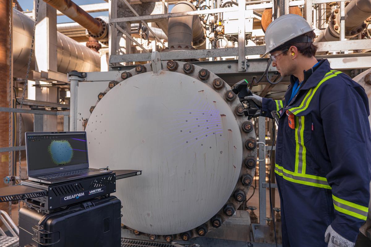 Outro equipamento de pressão com geometria complexa inspecionado com a digitalização 3D de alta precisão da Creaform