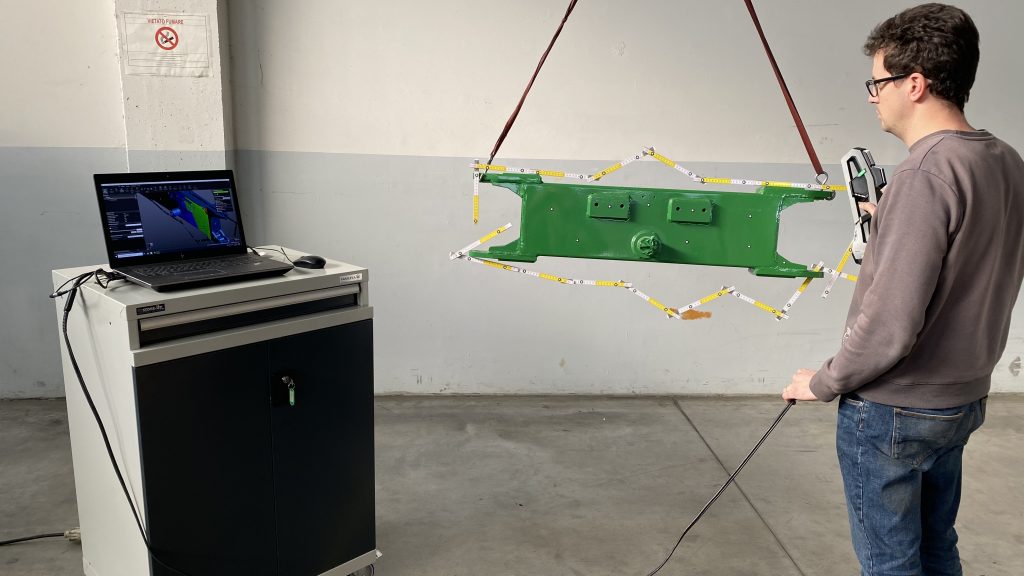 在将Creaform 的 3D 测量系统成功用于驾驶室之后,Monchiero 随后又将其用于检查机器的其他重要零部件。例如,可以更加简单轻松地检查轮轴和支架上的外倾角与其他倾角。因此,这实现了在组装前对组件进行干预,向供应商指出他们必须在哪里采取何种纠正措施。