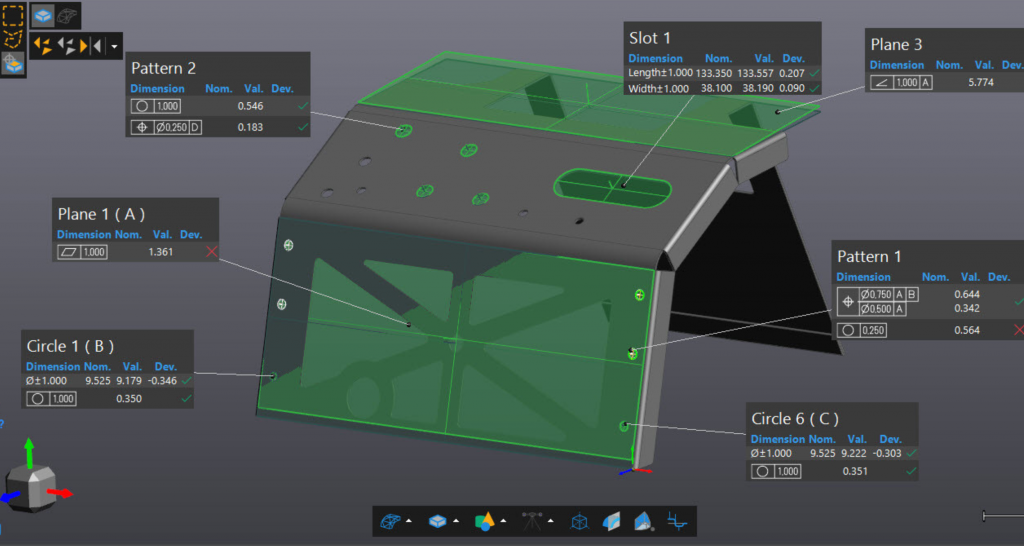GD&T 与检验过程紧密相关。质量控制和质量保证过程中的一个重要阶段是数据采集,这可以通过手动测量、触碰探测或三维扫描进行。通过这些技术,我们可以数字化处理一个零部件实体。然后,我们可以确定测量值是否与预期的几何实体(也称为 GD&T 标注)相符。我们通过将测量数据与 CAD 模型上显示的尺寸进行比较,以检查它是合格还是不合格。更重要的是,我们可以量化与极限公差的偏差。